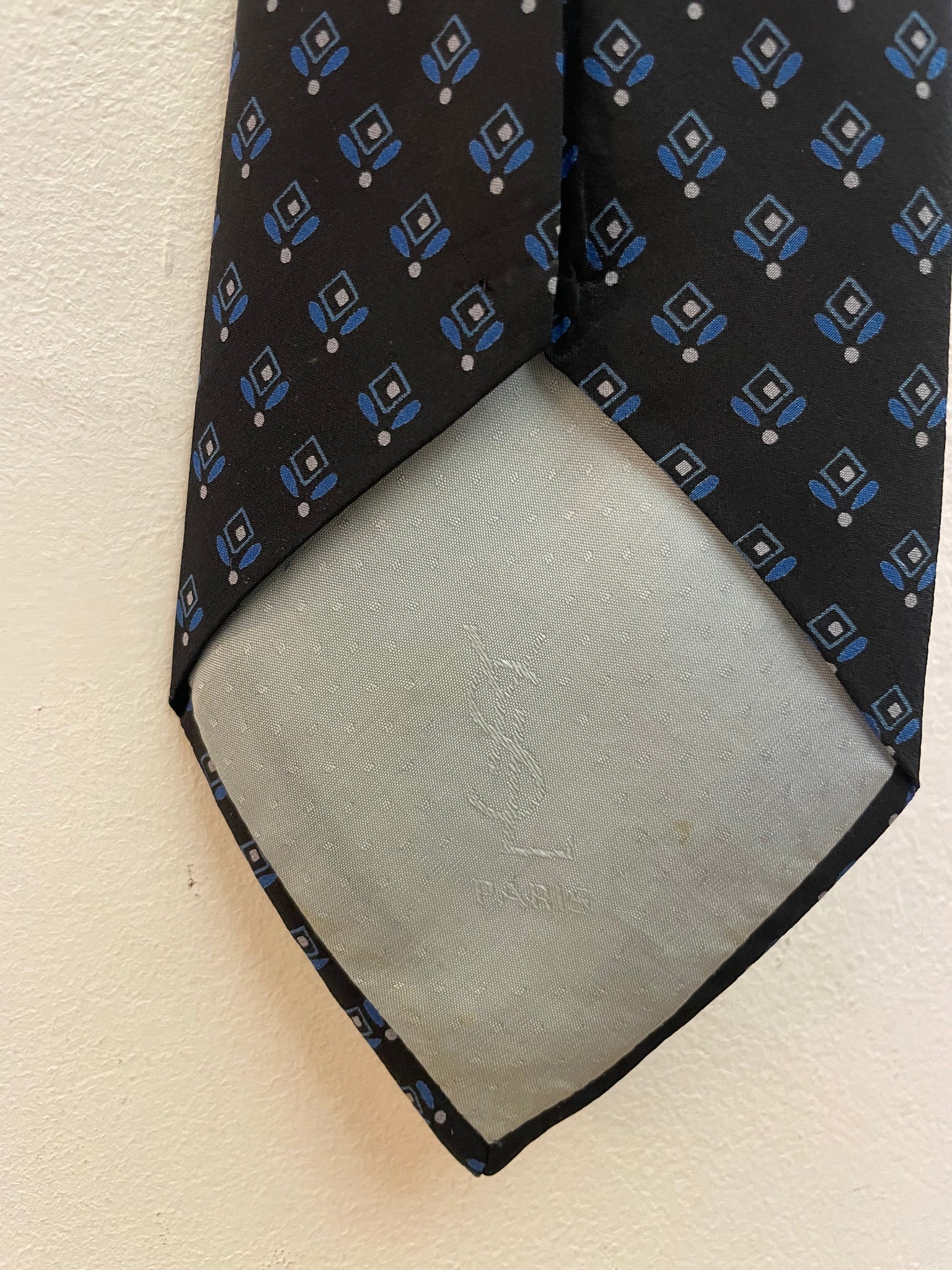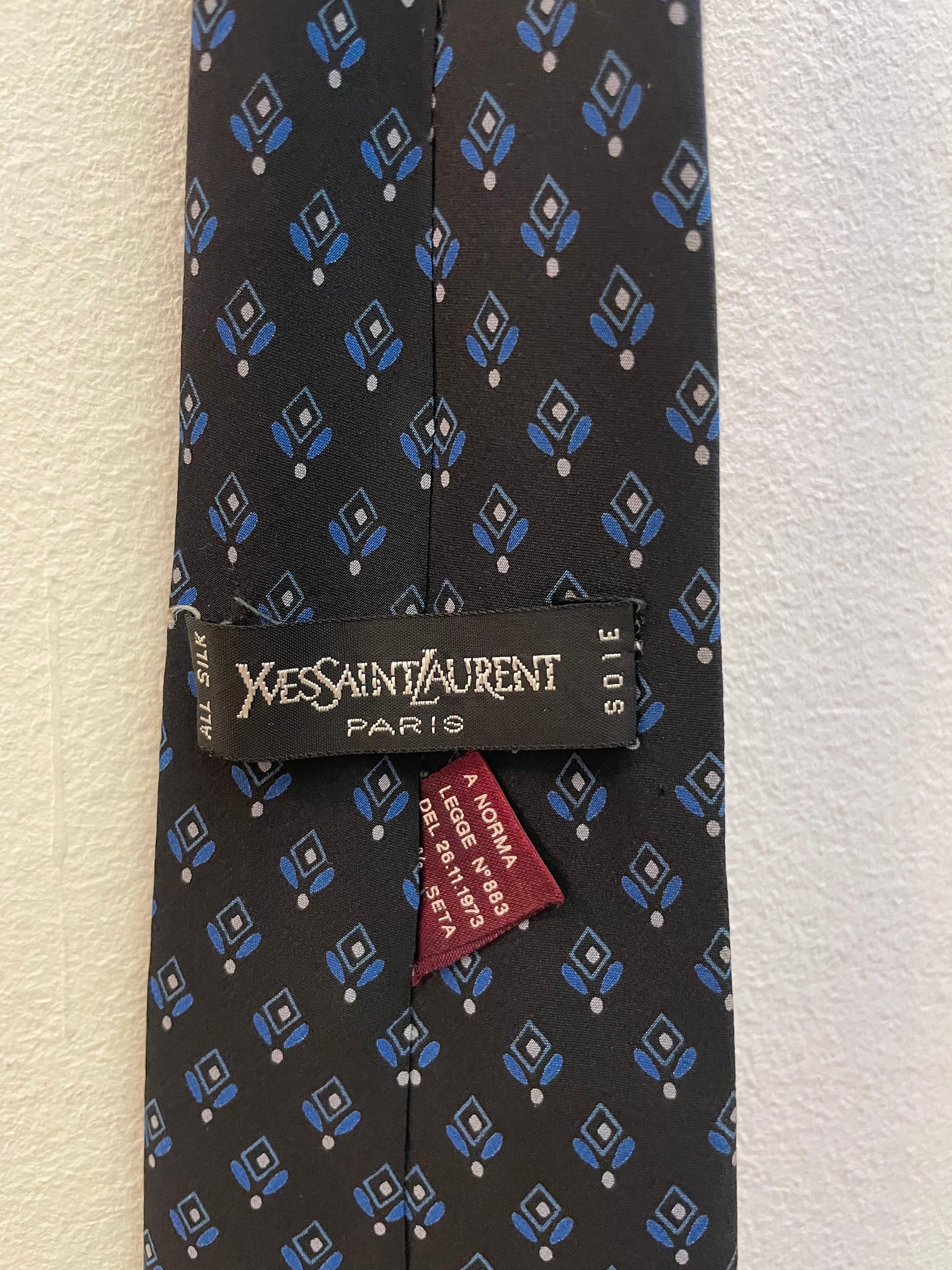 Questa autentica cravatta Yves Saint Laurent in pura seta rappresenta l'apice dello stile vintage degli anni '80-'90. Un accessorio iconico che porta con sé la raffinatezza e l'audacia del leggendario maison francese.
