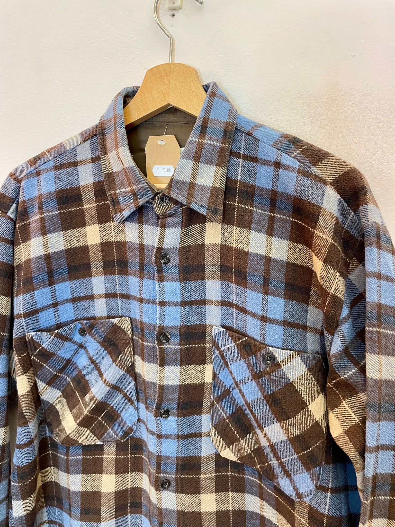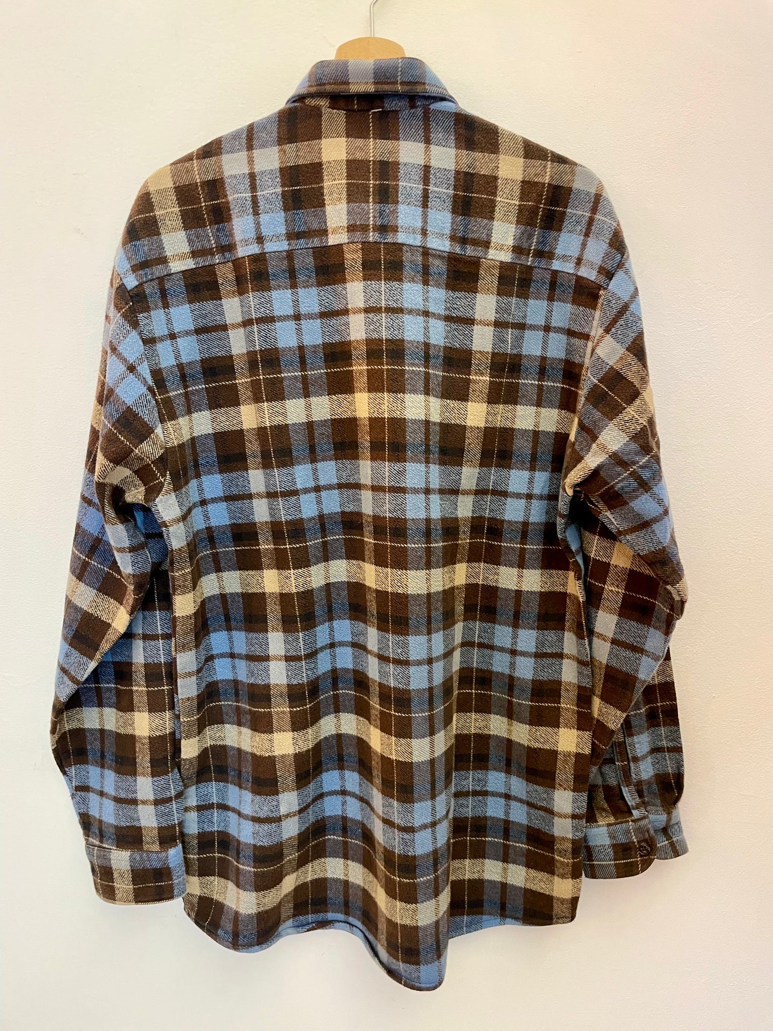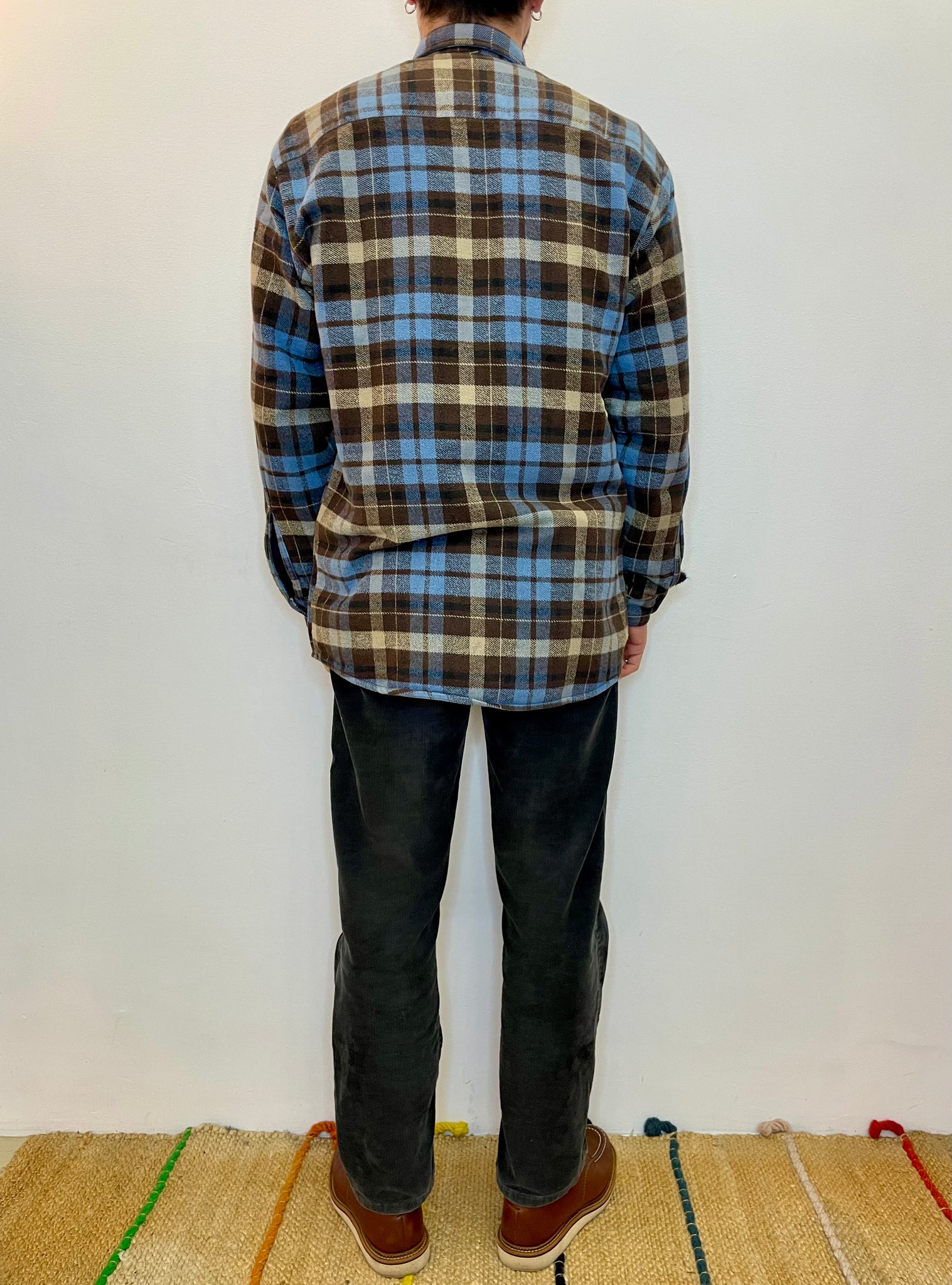 Camicia a quadri in flanella vintage azzurra e beige taglia L - Realizzata in leggera flanella per un look vintage e confortevole, questa camicia a quadri azzurra e beige è perfetta per l'autunno. La taglia L garantisce un fit comodo e alla moda. Ideale per uno stile casual e d'avanguardia.