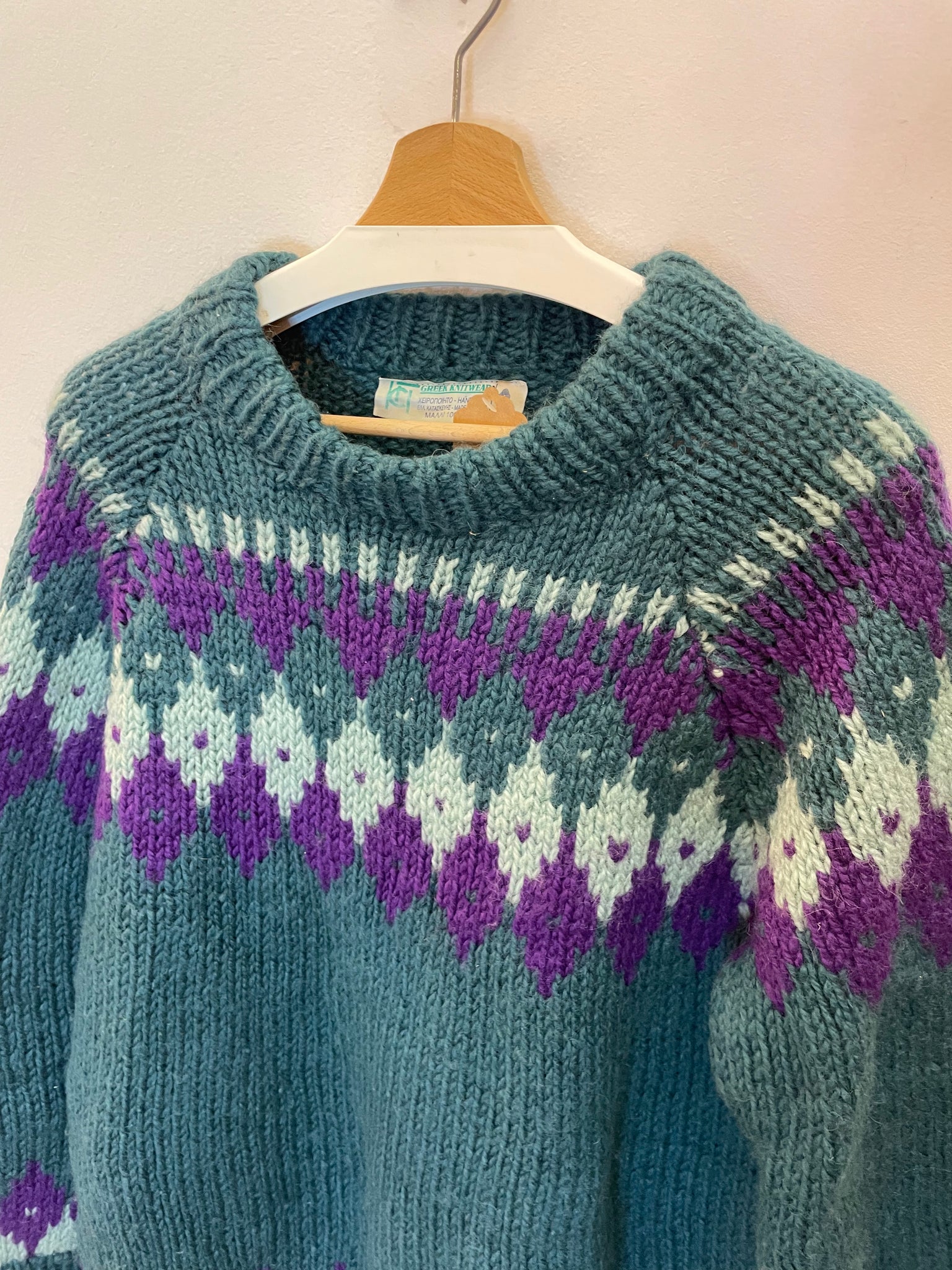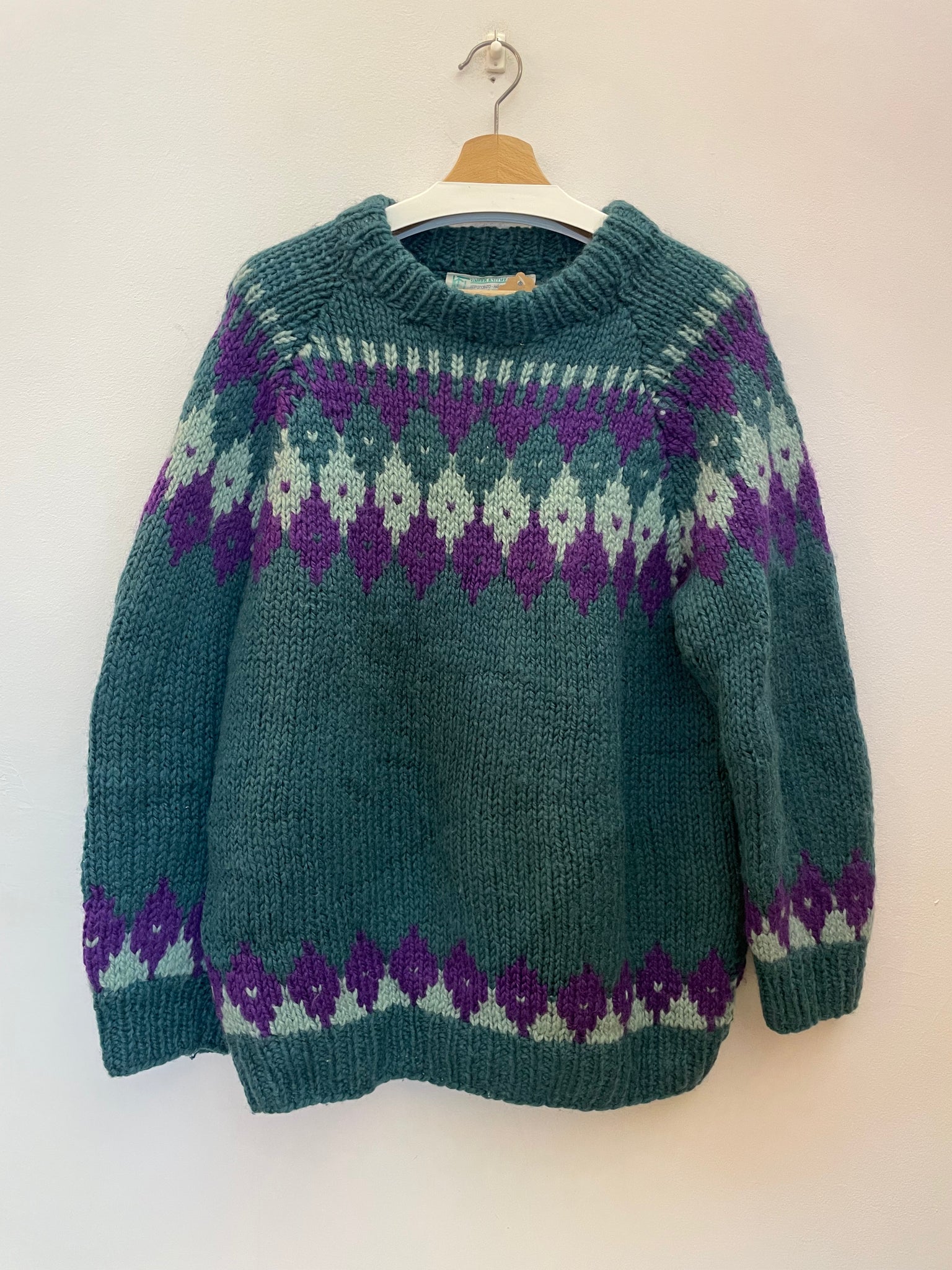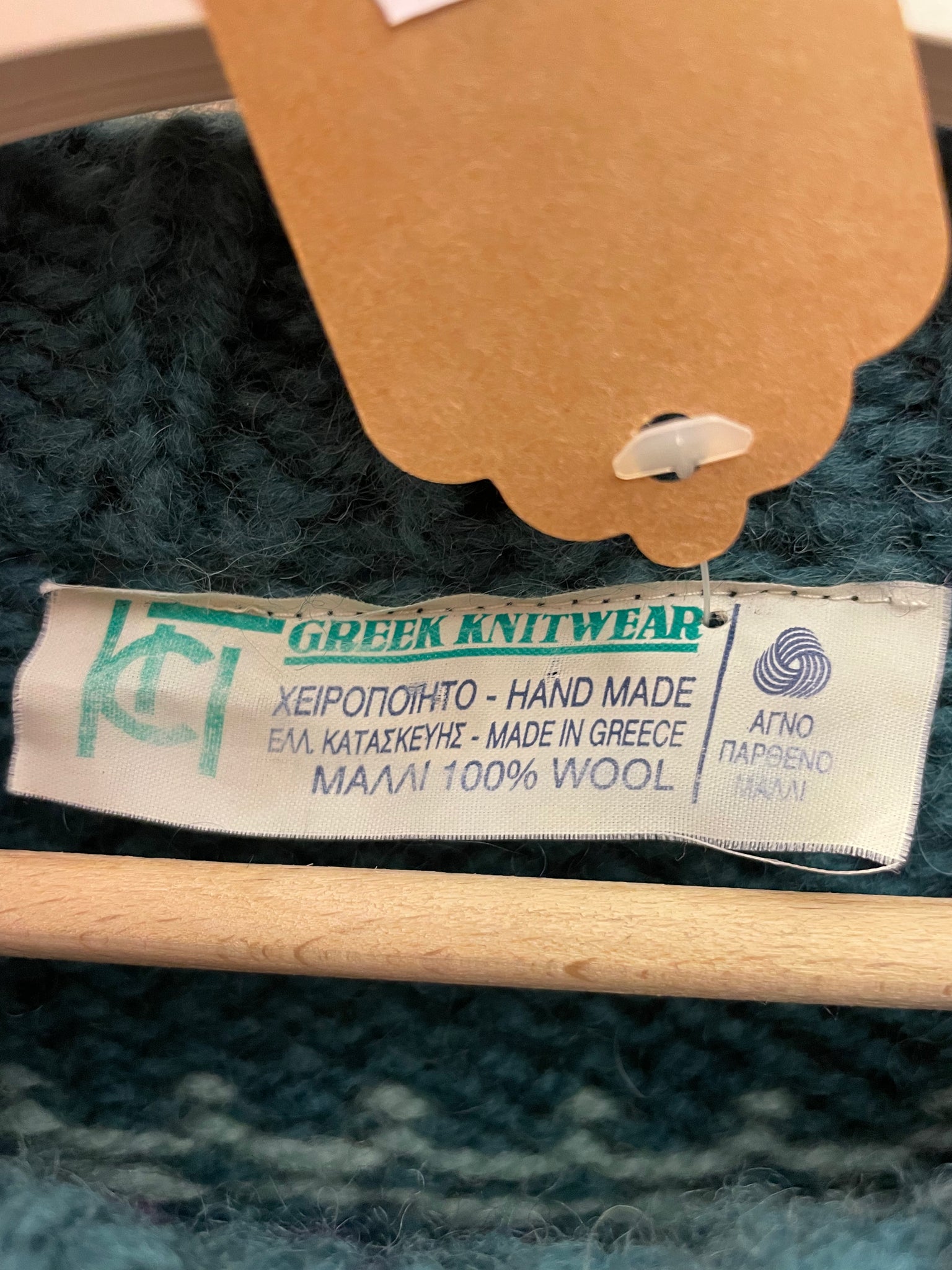 Maglione vintage in pura lana vergine greca con pattern geometrico Fair Isle, un capo d'archivio che celebra la tradizione tessile mediterranea. La lana di alta qualità offre calore naturale, morbidezza e una palette cromatica vibrante che unisce verde, viola e tonalità terracotta.