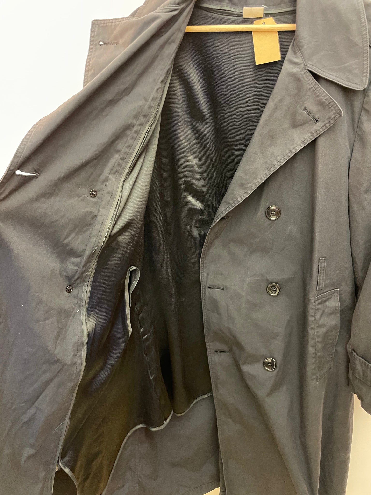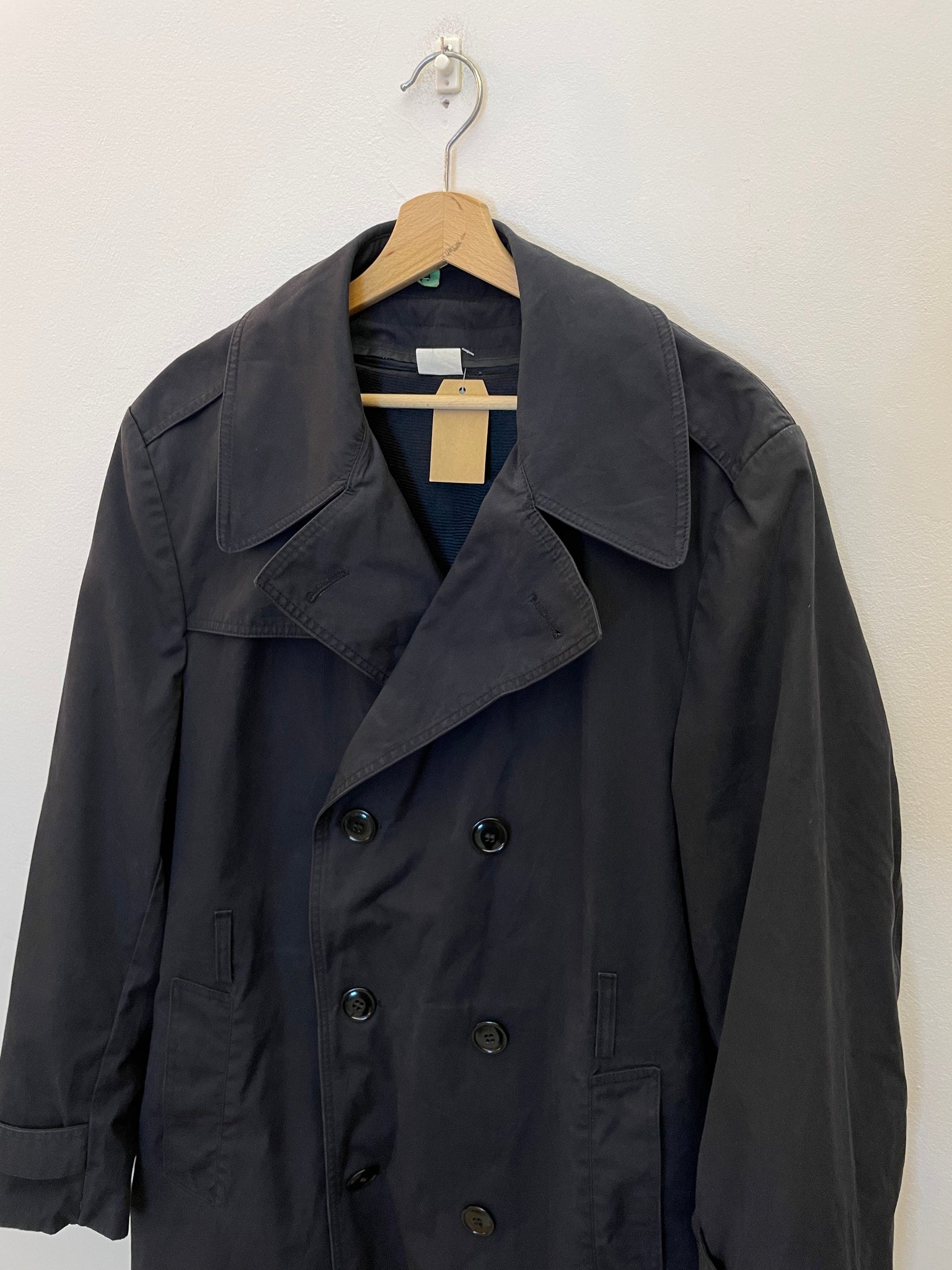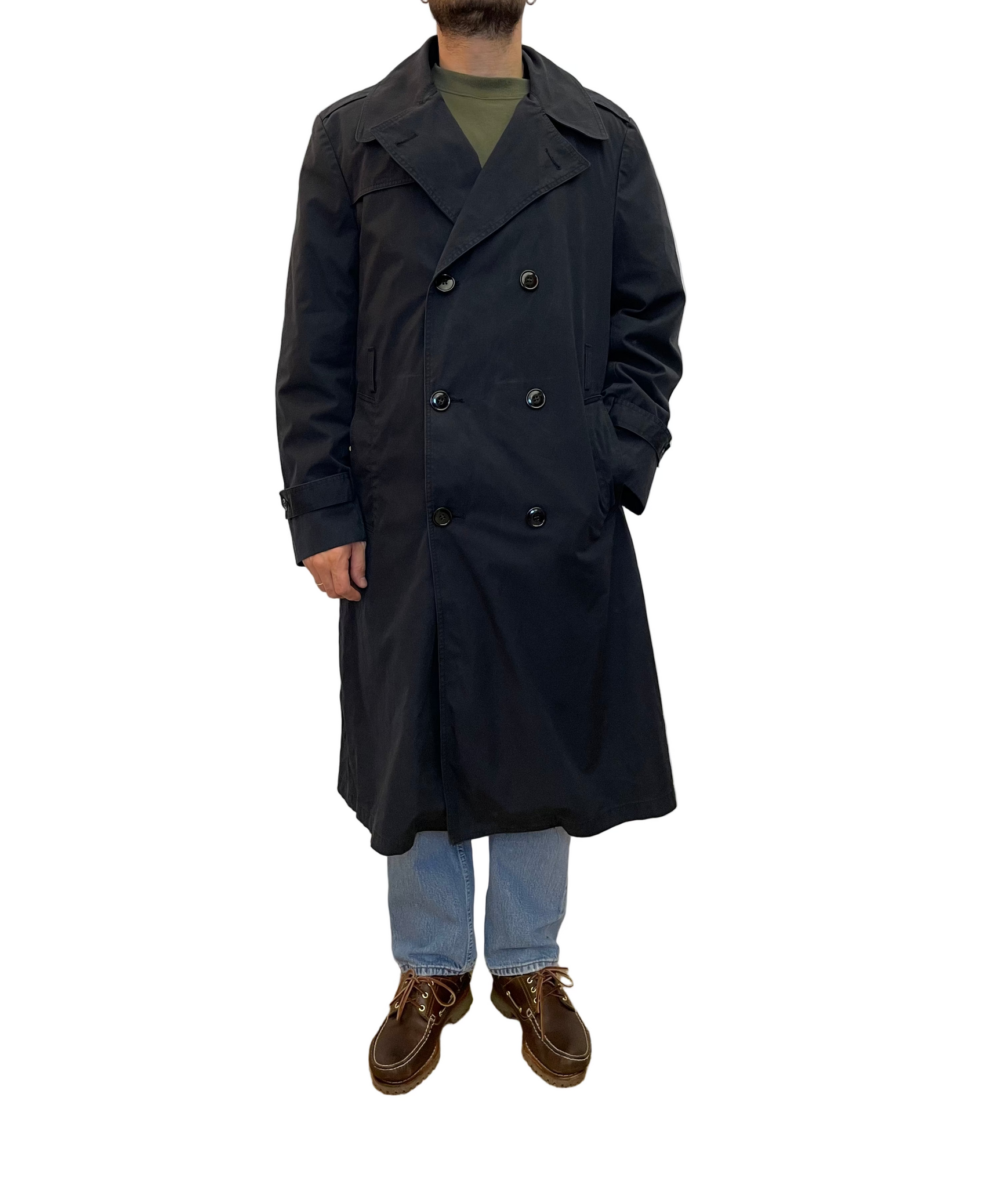 Realizzato in resistente misto cotone-poliestere nel classico colore Khaki/Verde Oliva, questo cappotto vintage è stato progettato per proteggere gli ufficiali in ogni condizione climatica. Ogni dettaglio racconta la sua eredità militare: spalline per il grado, carré antivento (gun flap) e costruzione robusta che sfida il tempo.