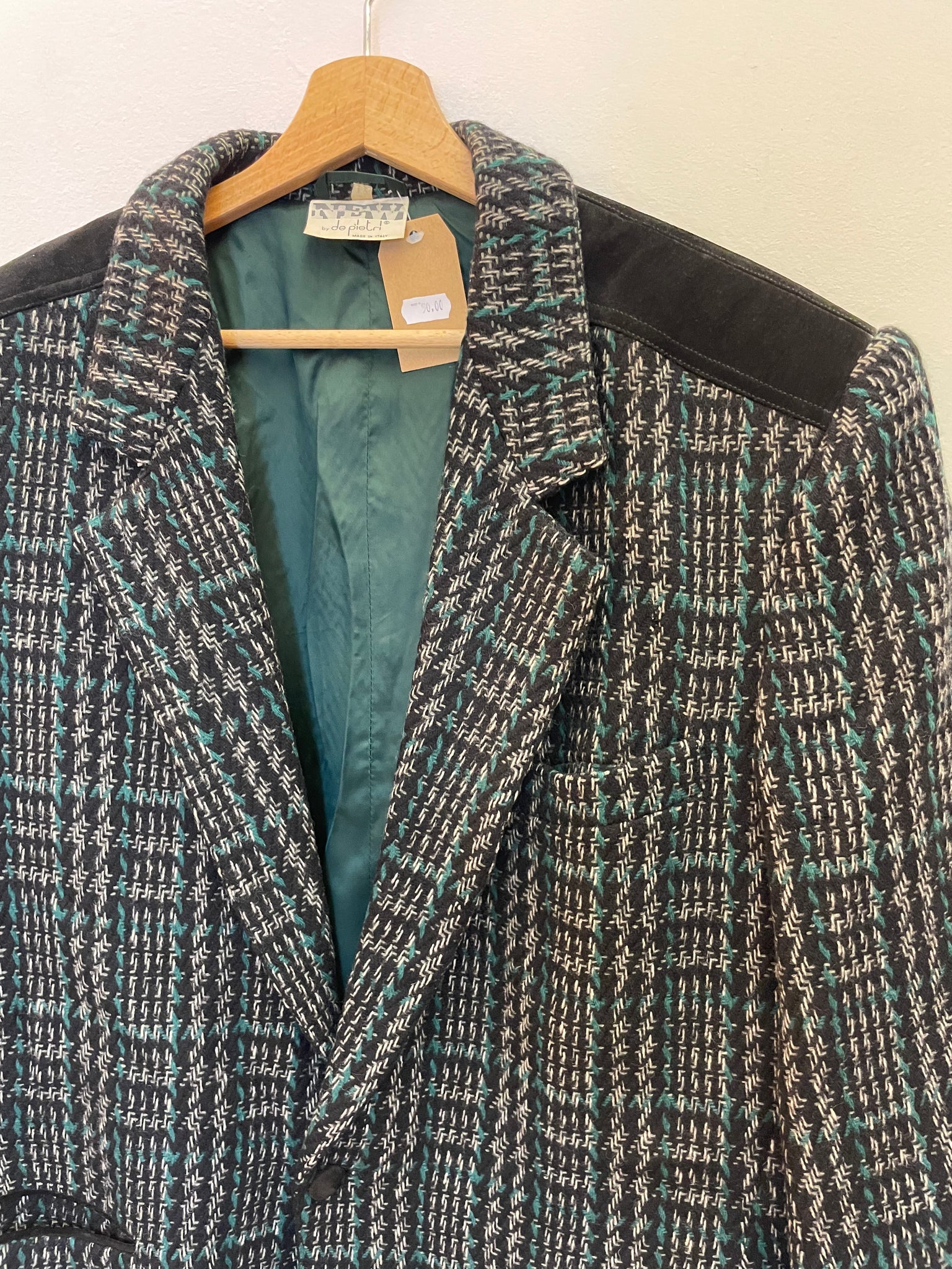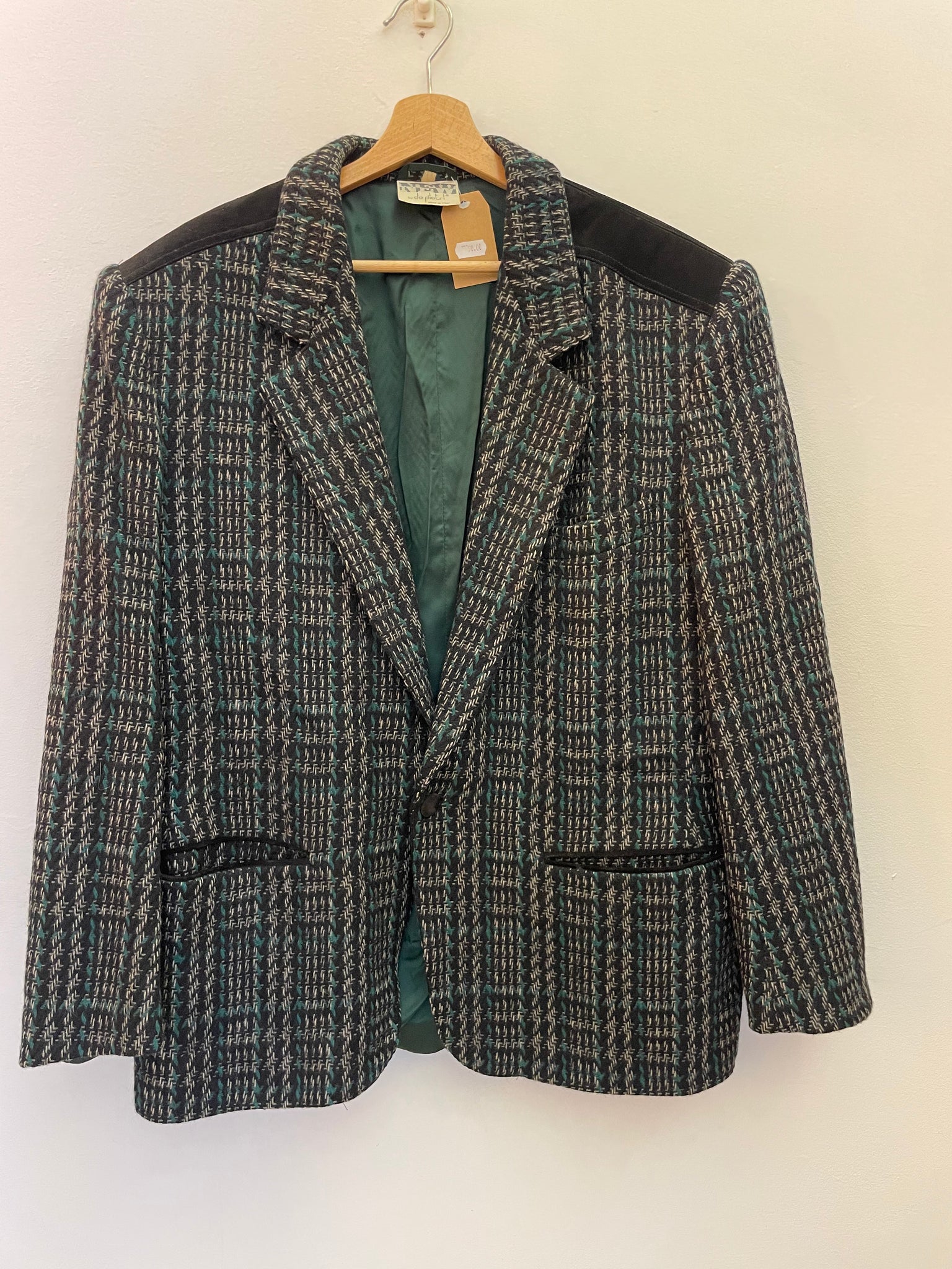Questo blazer vintage è un vero pezzo da collezione che unisce materiali pregiati in un design sofisticato. La combinazione di lana e cashmere offre comfort e calore superiori, mentre i dettagli in pelle scamosciata aggiungono un tocco di lusso artigianale che lo rende unico. Un capo per chi apprezza l'eccellenza nei dettagli.